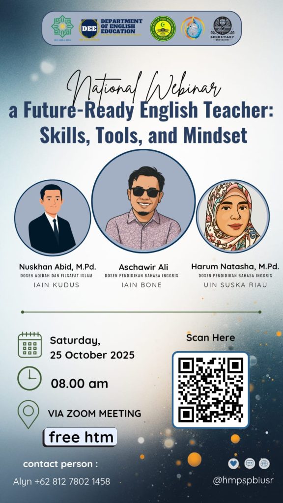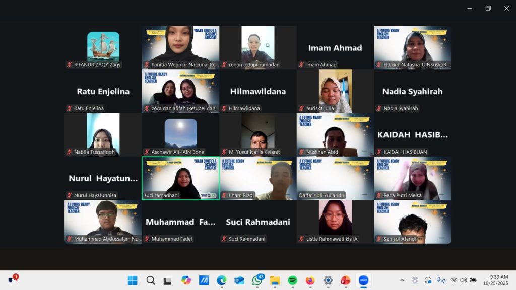 Pekanbaru, 25 Oktober 2025 — Himpunan Mahasiswa Program Studi (HMPS) Pendidikan Bahasa Inggris Fakultas Tarbiyah dan Keguruan Universitas Islam Negeri Sultan Syarif Kasim Riau sukses menyelenggarakan National Webinar bertajuk “A Future-Ready English Teacher: Skills, Tools, and Mindset” pada Sabtu, 25 Oktober 2025, melalui platform Zoom Meeting.